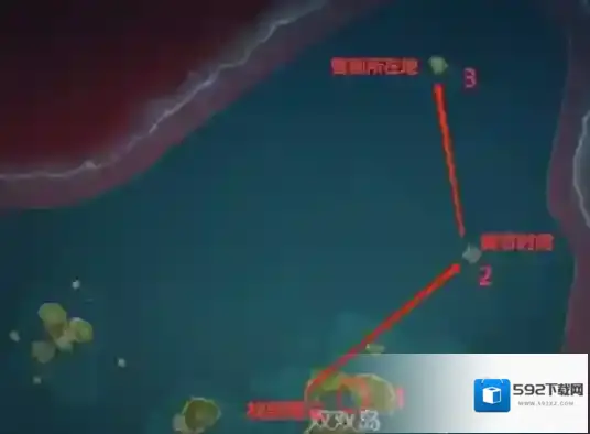 2、接下来,通过传送锚点来到双双岛。按照图中标记的方向前进,你可以找到位于标记处下方的石壁上的壁画。