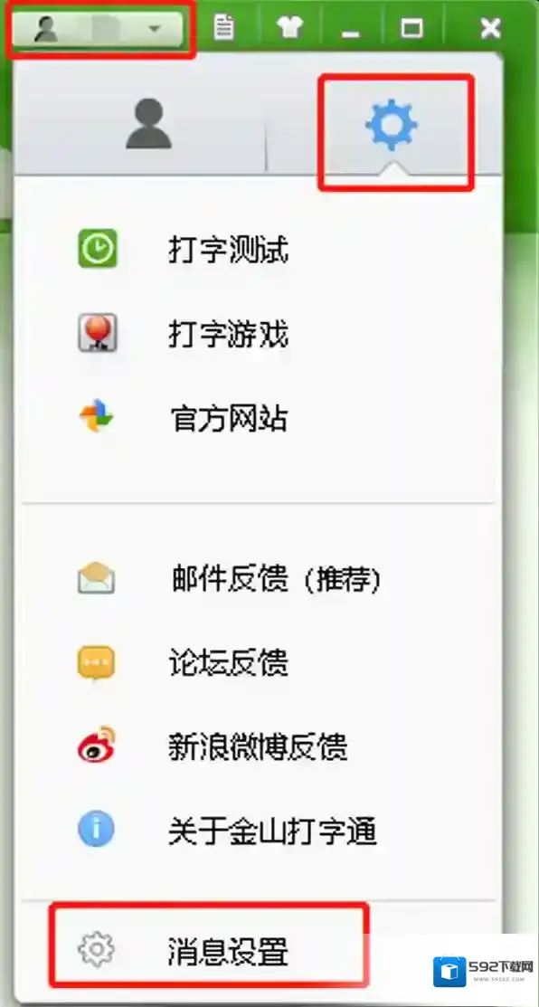 进入金山打字通客户端,登陆账号后,在页面的右上角点击自己的用户名按钮,在弹出的选项里找到设置,然后点击最下方的“消息设置”键,就能够设置消息通知了。