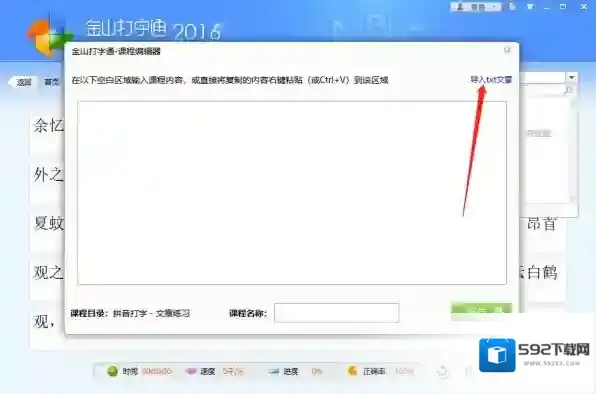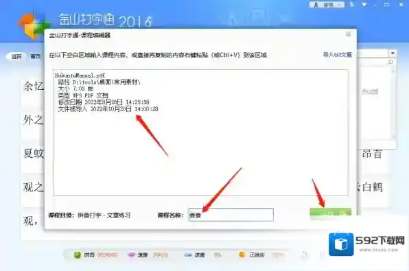 6、添加文章以后,显示在金山打字通的窗口页面,这时可以设置这篇文章的名称,输入在底部的“课程名称栏”,点击保存即可。