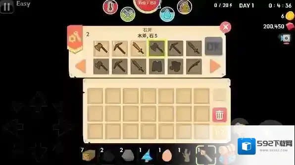 最主要的是先把武器做出来,点击左右按钮可以切换到武器制作栏,可以用五个木头来制作木剑,这样夜晚遇到邪恶生物也有自保能力,当然还可以制作木斧、木镐,这些都是前期必备的物资,有了这些,挖矿或者砍树都能更快。