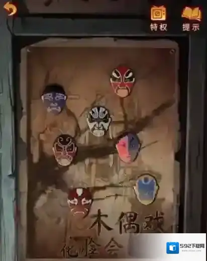 16、回到树上将脸谱摆放成下图这个样子,然后点击右边的红色戏台处用铁钩子勾出牌位;