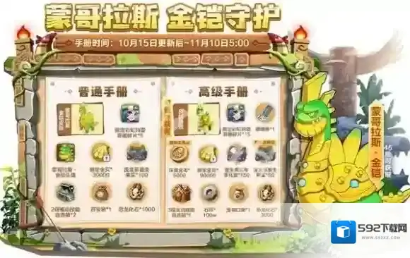 《石器时代觉醒》是石器时代觉醒二周年庆的福利大礼包,金铠手册让玩家免费领取限定皮肤!45级就能领取蒙哥拉斯·金铠皮肤,高级手册还能解锁特效版本。活动时间从10月15日到11月3日,通关副本任务还能加速升级,简直是皮肤控的天堂。还不知道的小伙伴们跟着小编一起往下看吧