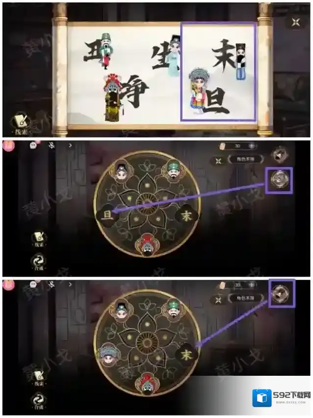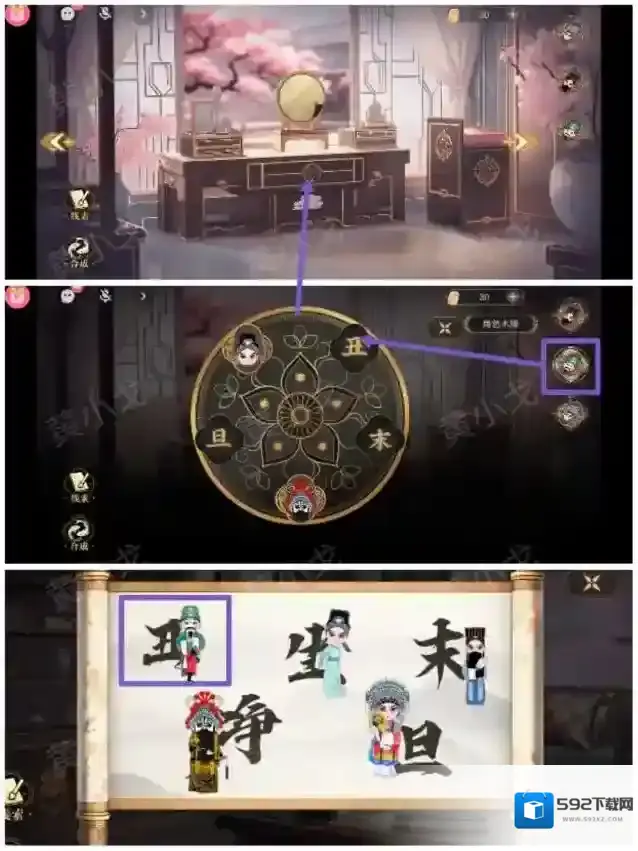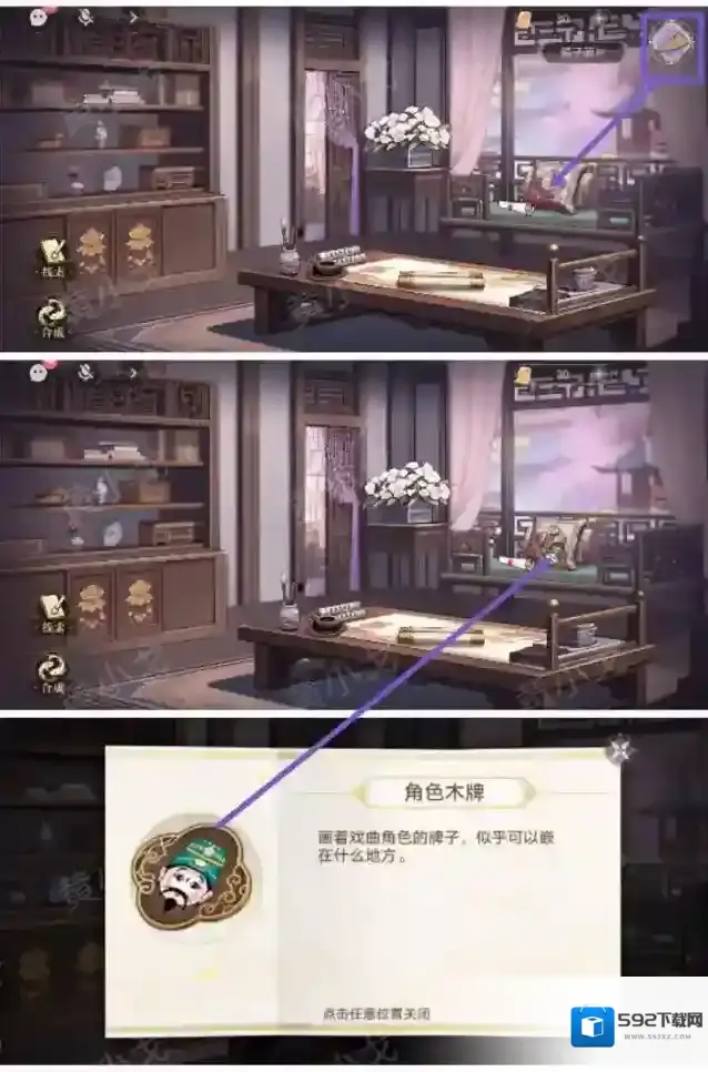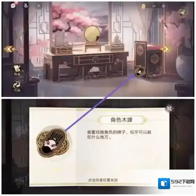 14.点击梳妆台抽屉上的密码锁,根据槽位上的文字,结合[书房]书桌上的卷轴上的线索,把三个角色木牌放入正确的凹槽中