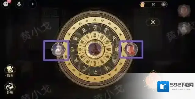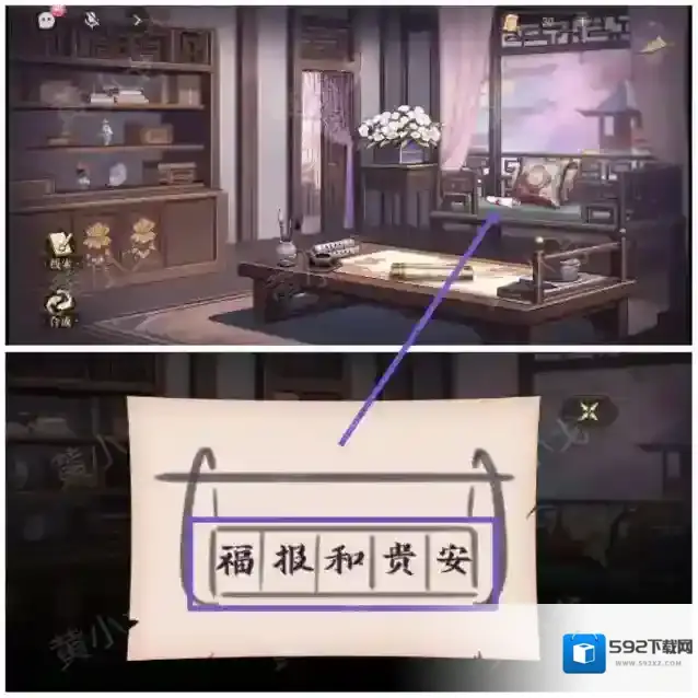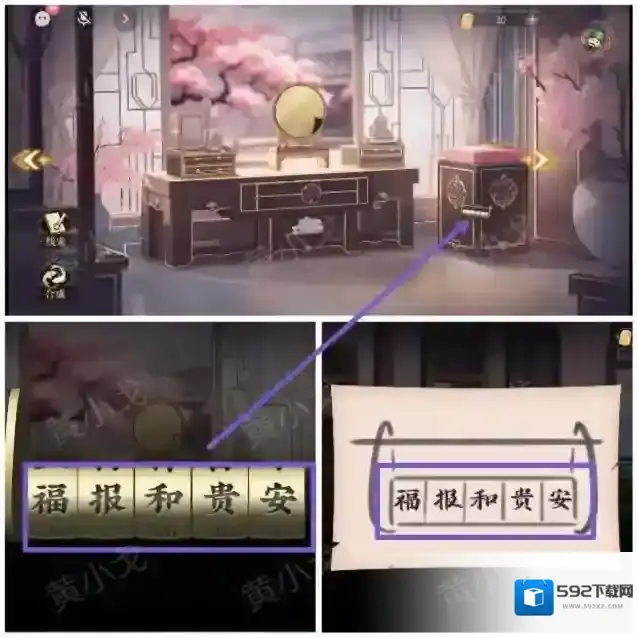 11.点击柜子上的密码锁,根据[书房]床榻上的卷轴上的线索,调整密码锁:福报和贵安