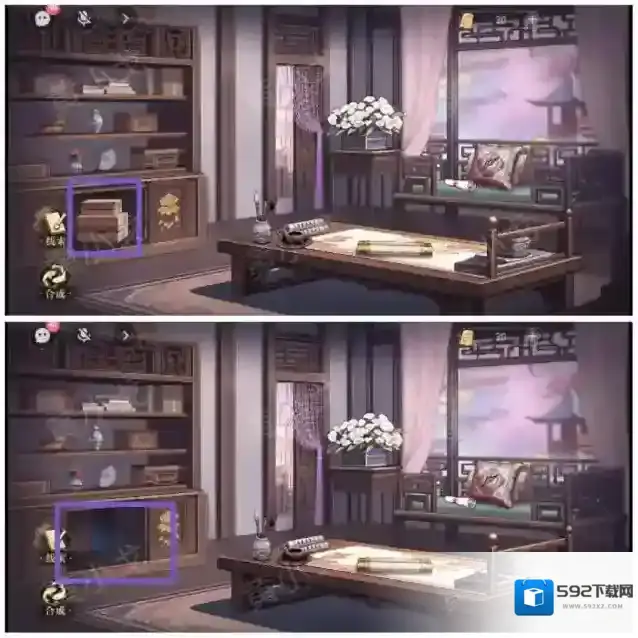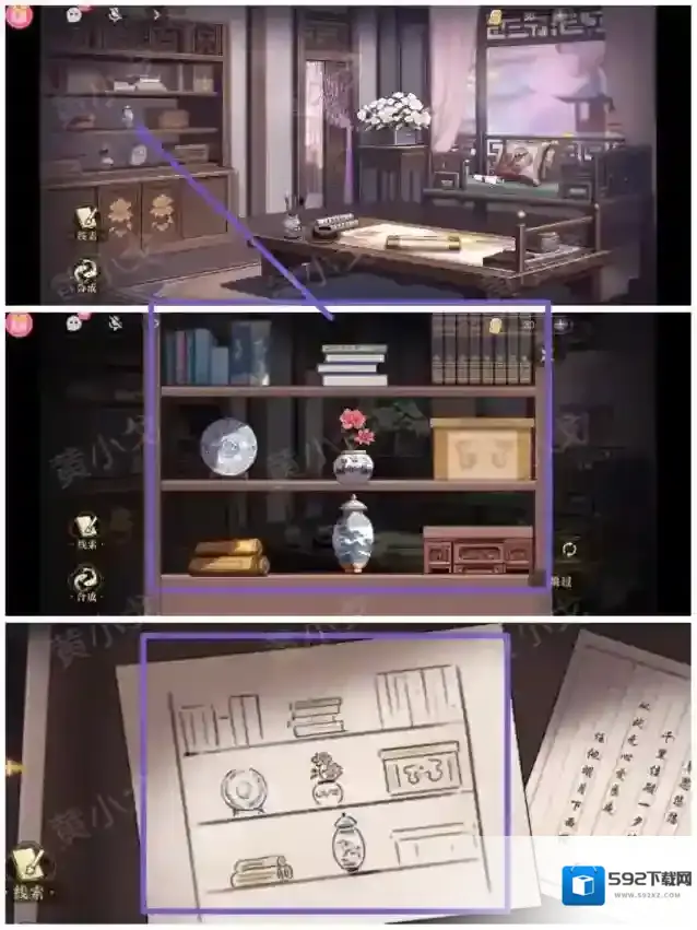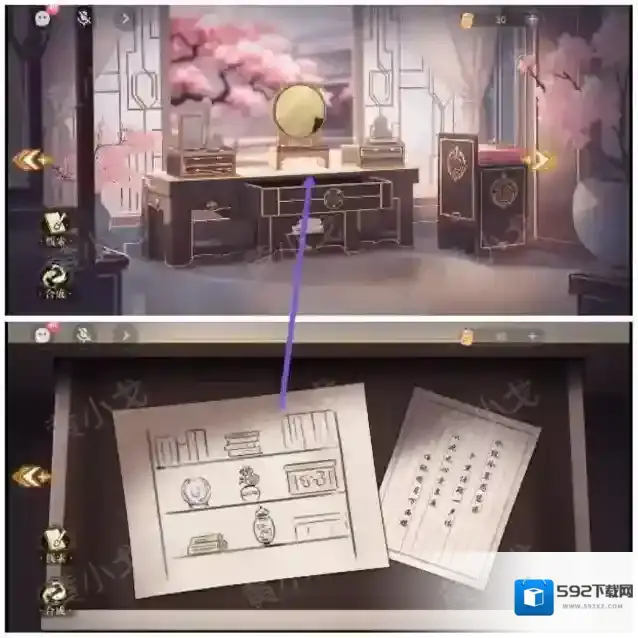 16.点击书柜,根据[闺房]梳妆台抽屉里的纸张内容,正确摆放物品的位置