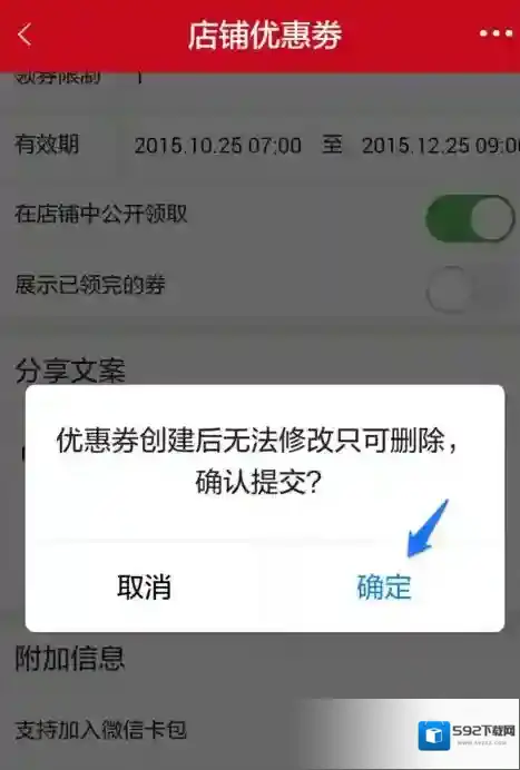 此时手机微店app会提示优惠券创建以后无法修改,只能删除,我们点击确定就可以了。