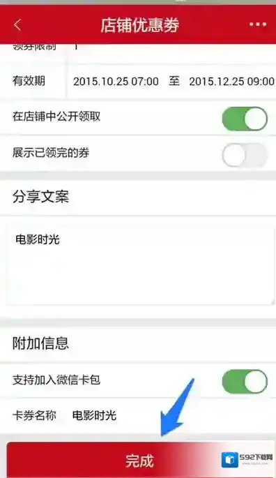 在微店的店铺优惠券下方根据自己的店铺情况输入分享文案,小编这里随便打字演示一下,然后可以选择是否加入微信卡包,最后点击完成就可以了。