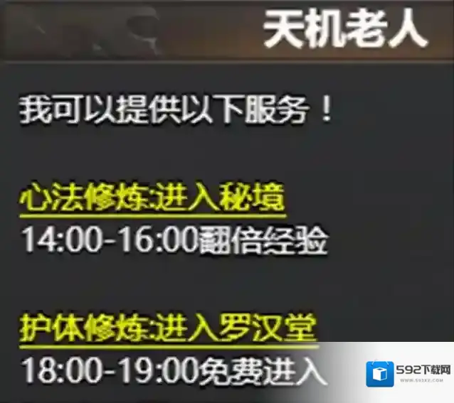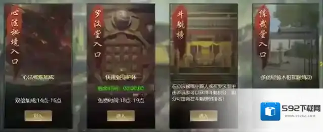罗汉堂:修炼护体–点击活动入口或者npc天机老人进入副本练武堂:修炼攻击类武功–点击活动入口进入副本