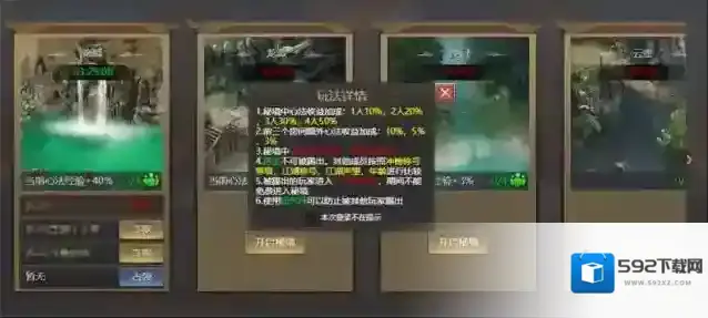 温馨提示:单个房间人数越多收益加成越高,前三个房间有额外加成,秘境全天开放但14-16点经验翻倍。房间满人可以点击夺取将其他玩家踢出秘境,房主不可踢出,被踢玩家10分钟内不能免费进入秘境,使用闭气丹可以防止被其他玩家踢出。