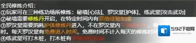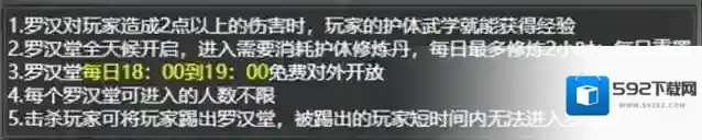 玩家可以使用护体修炼丹增加罗汉堂时间,选择房间进入,在罗汉堂内被罗汉造成2点以上伤害就能修炼护体武功获得经验。每天最多两小时,每日重置时间。