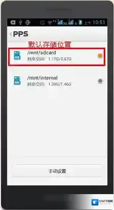 6、我们可以看到默认的存储位置为手机内存卡中,可以点击下方的手机内存,或点击最下方的“手动设置”按钮(此处点击手动设置项)。