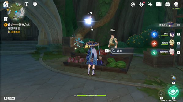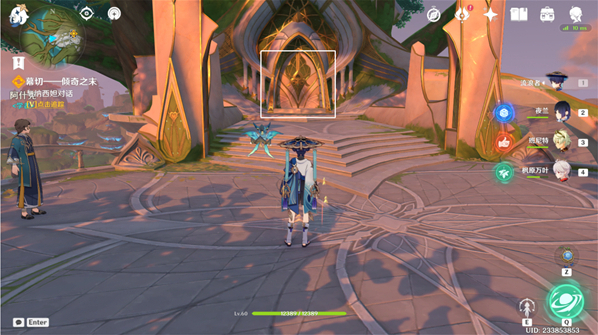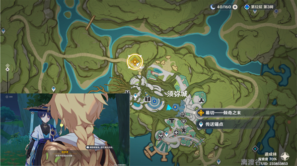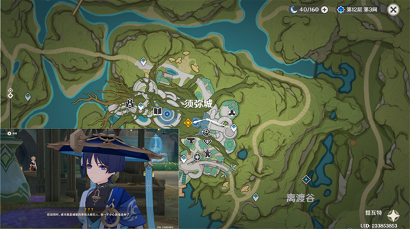传送须弥城锚点,进入净善宫,往地图的北方向走,与纳西妲对话
