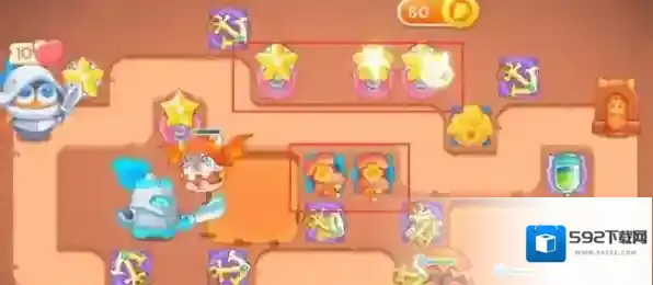 2.在下图所示位置放置星星塔,并升至满级,星星塔可以应对之后的飞行兔子。