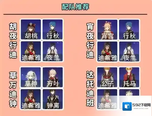 这一套与宵夜行班的区别在于迪希雅提供抗打断,很好的解决了宵宫身板弱的问题,唯一的区别是宵宫没有回血能力,生存方面要差一点,输出手法同上,把配队1中胡桃的部分换成宵宫e+普攻+q即可
