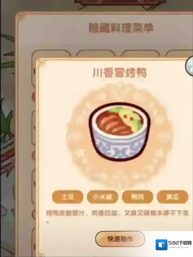 《我的休闲时光》属于深藏不露的黑暗料理培训班。当发现川香冒烤鸭需要小米椒时小编还觉得合理,直到看见土豆也在配料表里–这是要把鸭子辣哭还是噎死?感到兴趣的小伙伴们跟着小编继续往下看吧。