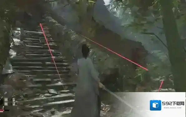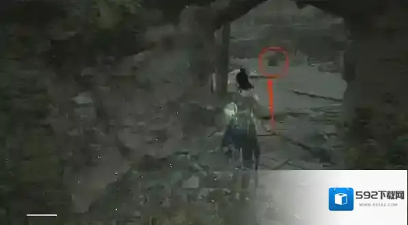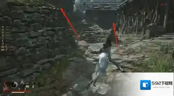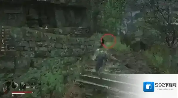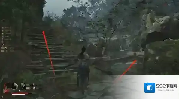 沿着路径继续前进,坡道上你会遇到一只竹笋。锁定并跑过去攻击竹笋即可收集它,之后可以交给熊猫商人换取商品。如果你错过了,可以在神龛处“入梦”后,竹笋会重新刷出来。前方河边的木桥处,右边可以捡到萌发的赤汞*1。