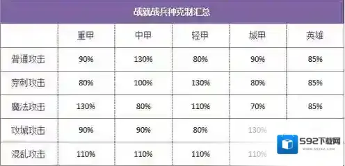 首先新玩家经常有一个误区:XXX兵种太强了,简直无敌!这里首先要说明的一点是战就战中没有无敌的兵种!真的没有!!!言归正传,兵种克制分为攻击克制和技能克制,攻击克制我为大家列了一份表格,简单明了。