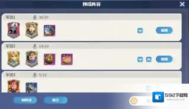 根据玩家现有英雄,士兵,科技等级,配置阵容,最多可以上场5只队伍,可以手动调整队伍配置和上场顺序,也可以一键同步现有队伍。