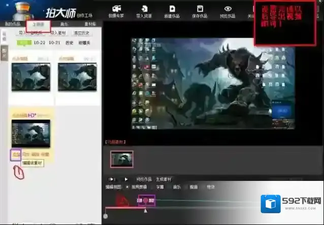(如果需要导出视频素材为其他视频格式,你需要在创作工场界面点主界面,然后选择你需要导出的素材,点添加(或直接用鼠标将素材拖到右边编辑界面),然后将下面时间轴上右边的小球拉到最后,再点右上方的“导出作品”按钮,接下来按步骤二的操作即可完成)