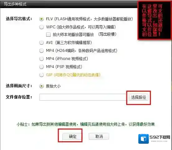 步骤二:选择你需要导出的视频格式,然后点“选择路径”按钮,选择你导出后的视频位置后,点下方的确定,等待导出成功即可。