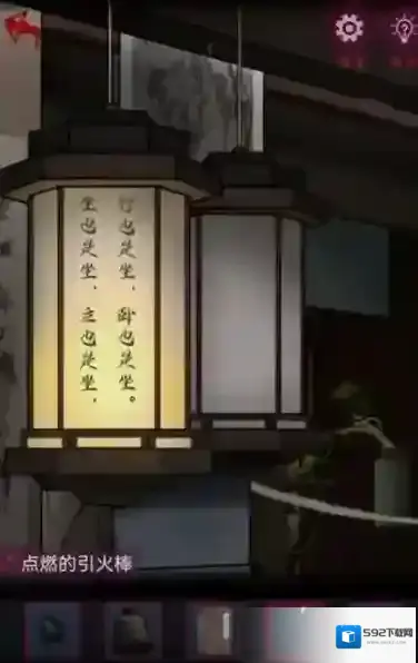 7、在门外挂上灯笼,使用打火石点燃木炭,引火棒点燃4个灯笼,开始猜灯谜。