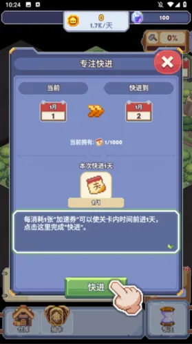 4、等待期间你可以放下手中的手机,专注于生活中的事情,获得到加速券后,选择使用加速券,点击快进即可快进到下一个日期;