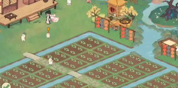 4、考虑到方便性大家可以把田地连成整片,穿插去往桃花树的水路。
