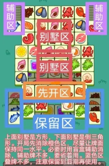 开局先消除橙色区里的牌,尽量让牌面保持在同一水平面,然后一层一层消除表面牌,不要跨层太多,等表面牌消除完后,以大别墅内互相消除为主