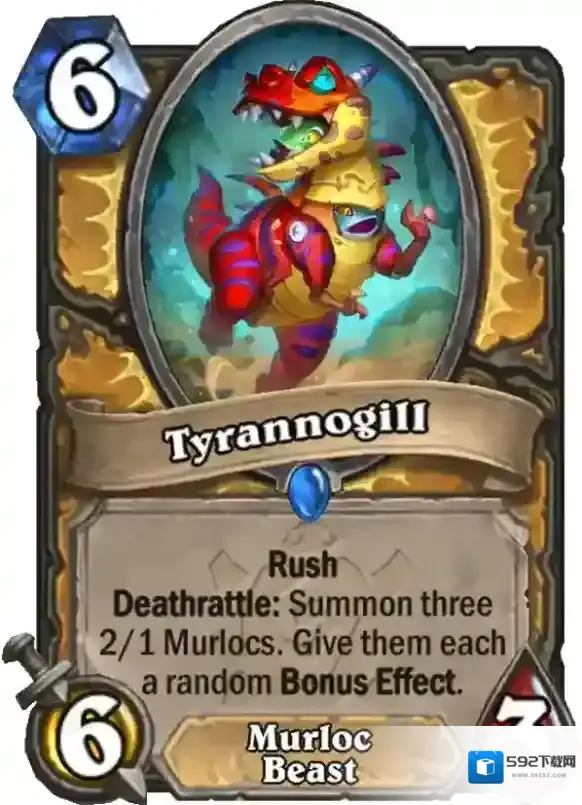 6费6/3.突袭。亡语:召唤三个2/1的鱼人,随机使其各获得一个额外效果。