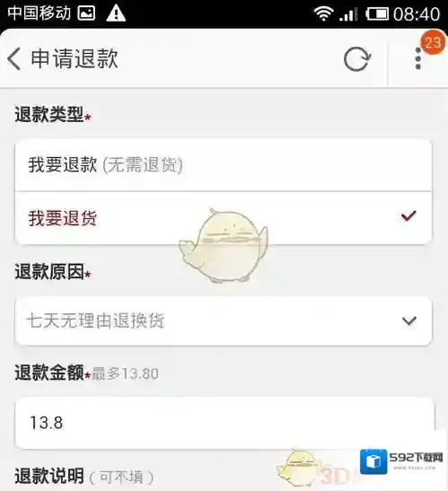 选择退款类型→我要退货→退款原因→七天无理由退换货→输入退款金额→填写退款说明,再提交审核→待卖家审核通过,然后您再寄货品回卖家,完成退货操作。如图:
