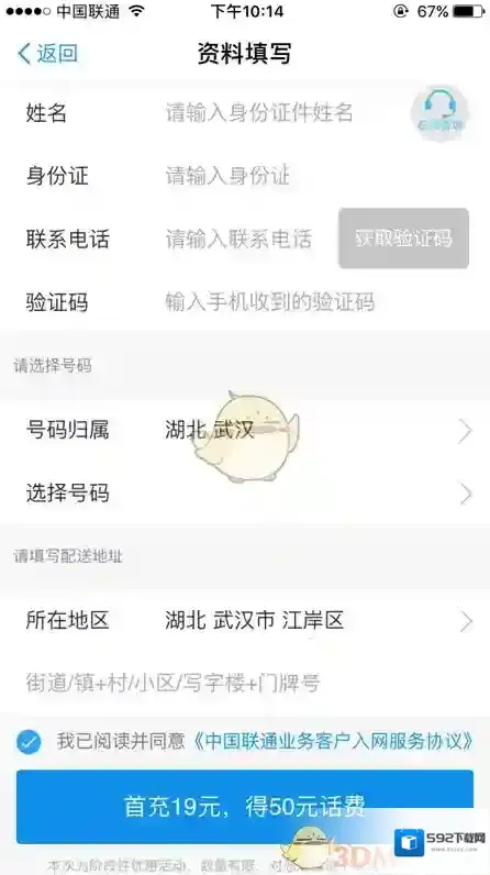 六、进入到此页面填写相关申请资料:姓名、身份证、电话、选号、收货地址(要注意:所选卡号地区要与收货地址是同一个省份),如图所示。