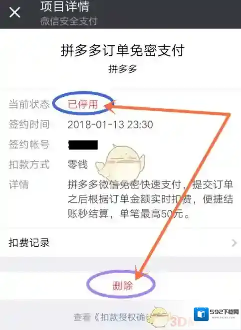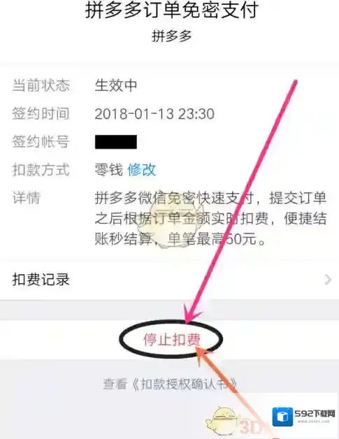 6.在项目详情中,点击“停止扣费”,即可取消此项目的免密支付,如图所示