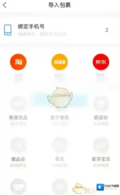 3.在这个界面可以看到可以绑定多个网购平台的账户,可以了解到不同平台包裹的情况,上面还有个绑定手机的功能。