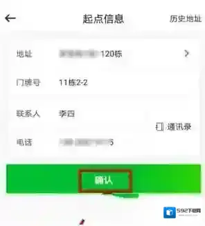 这时就自动进入到“起点信息”的输入页面,在页面中输入起点的地址、门牌号、联系人、电话等信息,同样的在页面下方点击确认。
