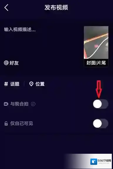 然后进入到视频发布界面,找到与我合拍选项,滑动后面的开关。