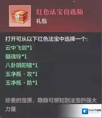 注:完成御灵手册第十九天任务后可领取红色法宝自选箱,在此之前,尽量选择稀有度高的法宝培养即可。