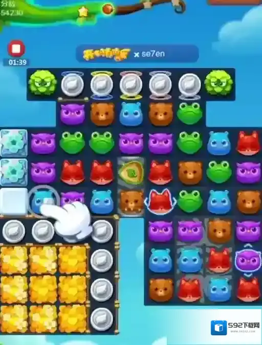 4、然后可以开始移动右下角的蓝河马,可以消除一个横排和一个竖排的动物。