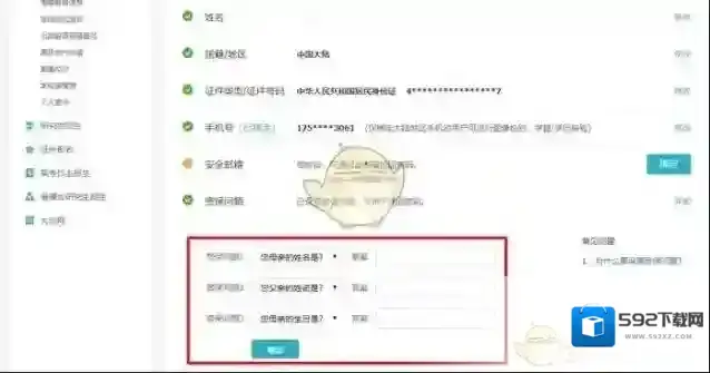 6、在账户管理下,我们可以看到账户绑定的手机号、身份证号,以及密码、邮箱等,找到密保问题,然后点击右侧的修改功能,设置三个新的密保问题,最后点击确定。