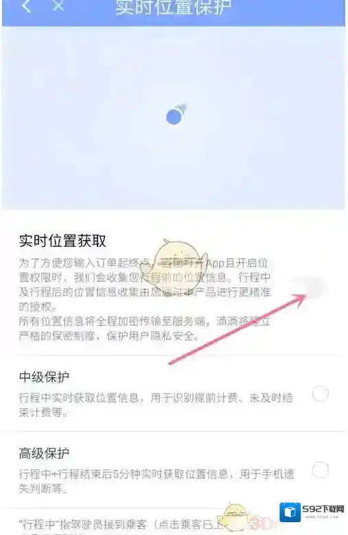 4、进入实时位置保护的页面在实时位置获取栏选择“开关”按钮即可。