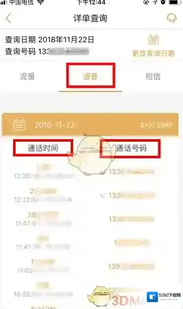 6、点击“语音”可查询的是该日期下的通话详单。页面会显示通话的总时长、通话时间以及通话号码。