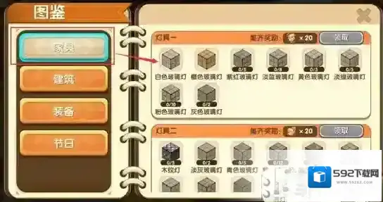 在图鉴里面找到家具一栏,就能找到淡蓝玻璃灯。