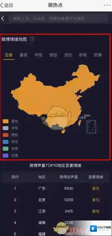 6、从这里进入微博情绪,查看情绪占比、情绪地图等数据,如下图所示: