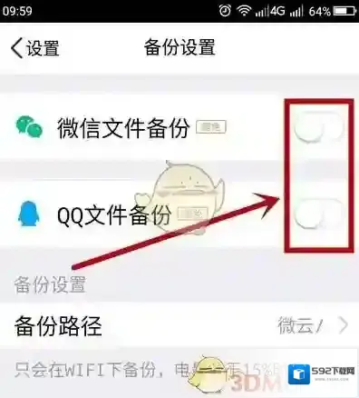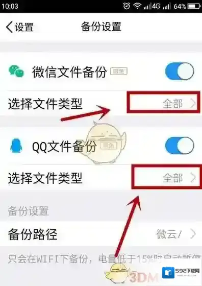 5、进入备份设置页面后,选择需要的备份选项微信文件备份、QQ文件备份选项单击,也可以同时勾选