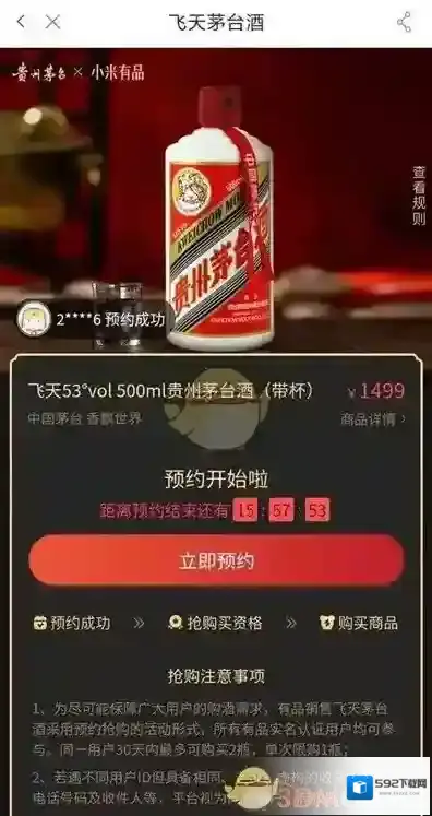 3、小米有品茅台抢购时间是工作日(周一到周五,遇到大促另行规则)早上10点,提前预约成功后和有抢购资格,才能在开卖时候抢,如果没抢到,10点半后又开始新一轮预约,一直到第二天的9点30分。