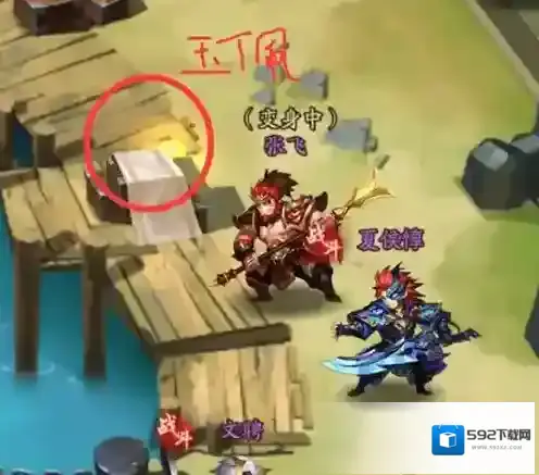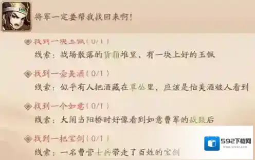玉佩在河边上的货箱堆里、美酒在地图右边的草丛里、如意在曹军战鼓后、宝剑在士兵身上