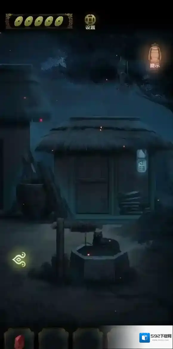 3、点↓,会看见土地爷石像右下角有个暗格,石像前的灯笼没有亮。要求我们按照正确顺序点亮灯笼,触发开关。