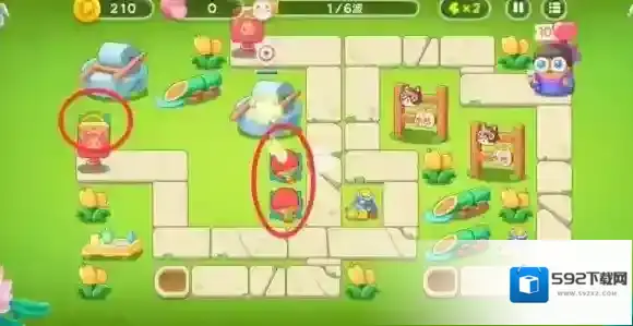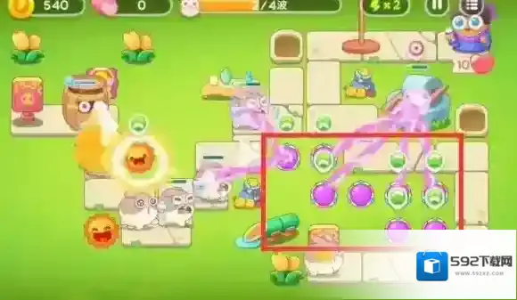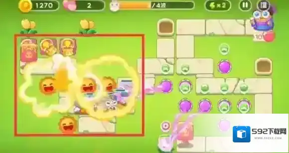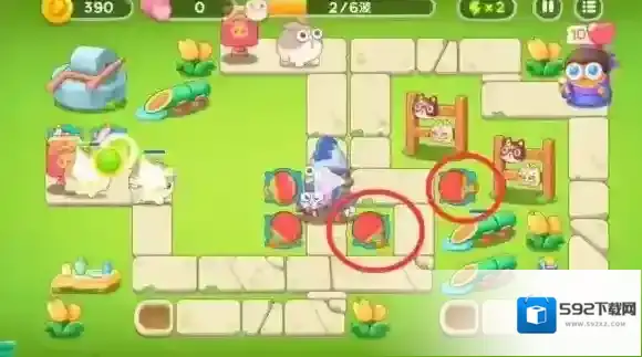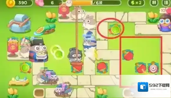 1、玩家进入游戏关卡后在下图标记处放上魔法球,左边的用来清怪,右边的清建筑,有钱之后在左边的空位上多摆放几个。