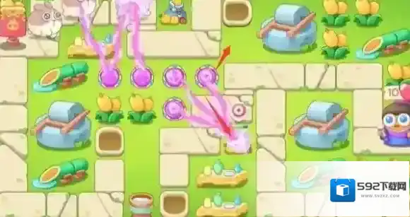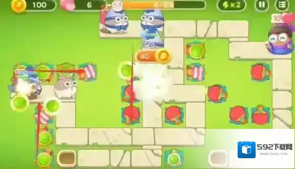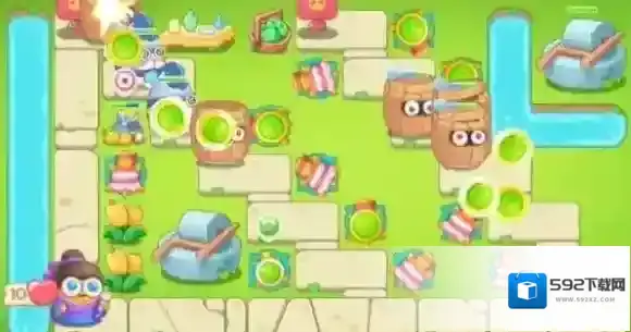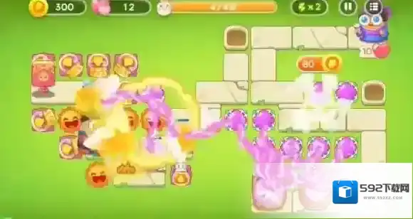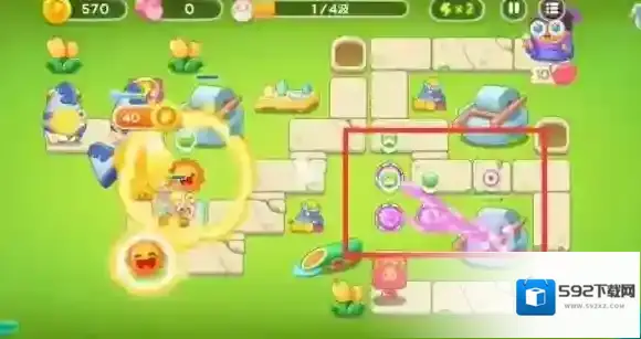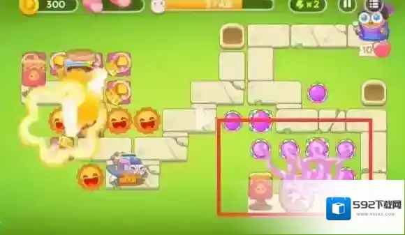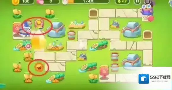 1、玩家进入游戏关卡后首先在左下出口这里放上乌龟来清怪,右边放上乒乓球牌清理建筑。