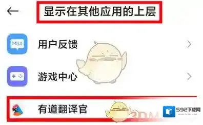 4、然后会进入设置,可以在“显示在其他应用的上层”设置中点击“有道翻译”。