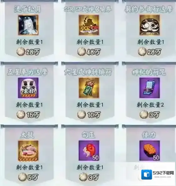 具体的商店资源方面包括白蛋+蓝蛋x99、三星白蛋x1、紫蛇皮x100、金达摩x5、百鬼票x20、御灵钥匙x20、遗忘绘本x200、小经验书x10、四星青吉鬼御魂x10、樱饼x100、体力x2500、金币x1000W、勾玉x50